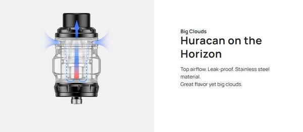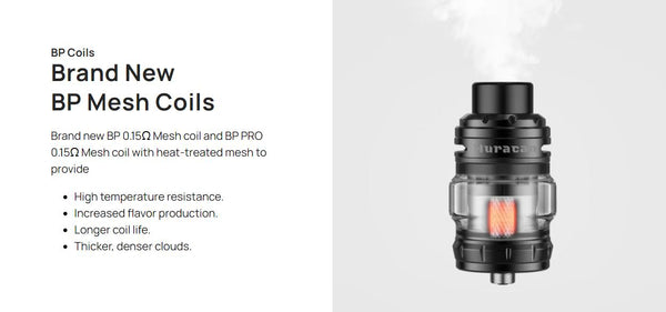 the Huracan tank with 6ml juice capacity and easy top refills. In the package, you will find a 0.15ohm BP mesh coil that fires from 80 to 100 watts and a 0.3ohm BP Mesh Coil that operates between 30 and 40 watts. If those don’t satisfy your puff style, there are 2 optional coils as well.