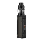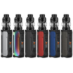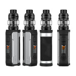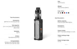 Aspire Rhea X Kit. The mod features a single 18650 battery, fast charging, 100 watts of max power, a full-color screen with easy UI, and 5 modes including temperature control. The kit comes with the Huracan tank features a 6ml juice capacity, easy refills, leakproof adjustable top airflow, and mesh coils.