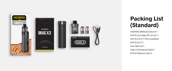 Drag X2 Kit is powered by single external 18650 battery with 80w max and Type-C charging. It is designed with 5ml capacity, easy side filling system, and top airflow intake. VOOPOO Drag X2 adopts button activation so there are few safety concerns. It also adopts PnP X Platform that features A-Ten lifespan to bring you long-lasting use, thermo-stable cotton to bring consistent taste, mesh-distributed heating system to bring denser cloud, patented 4-layer leak-proof design to avoid leakage and automatic production to increase production efficiency.