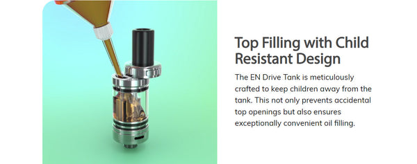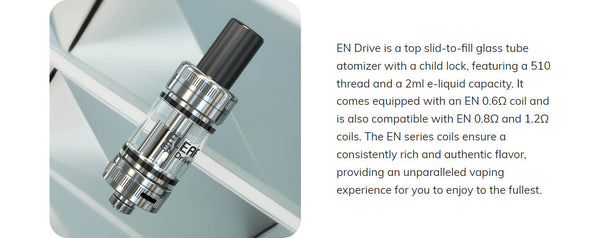 Eleaf EN Drive Tank is a top slid-to-fill glass tube atomizer with a child lock, featuring a 510 thread and a 2ml e-liquid capacity. Eleaf EN Drive Tank is sleek...