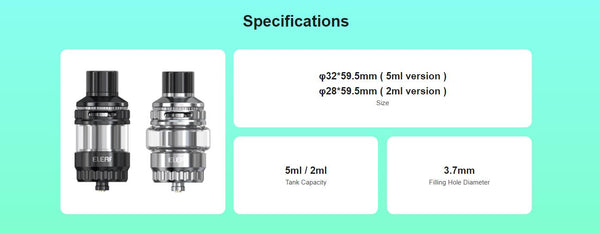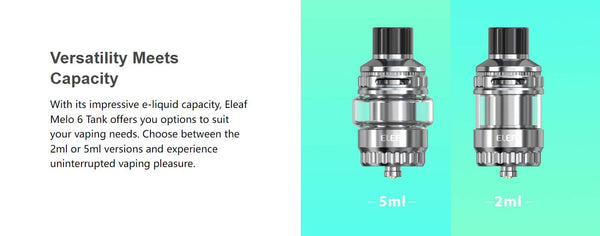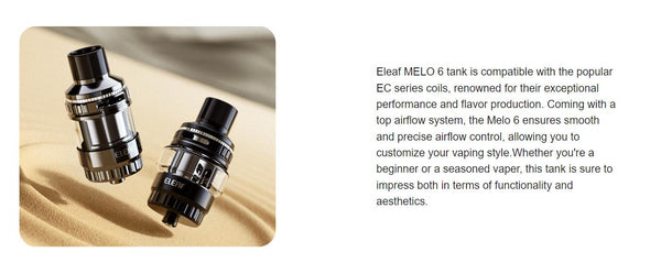 Eleaf MELO 6 is Coming with a Leakage-free Top Airflow Design, hold 5ml/2ml ejuice capaciy,the Melo 6 ensures smooth and precise airflow control, allowing you to customize your vaping style.compatible with the popular EC series coils, renowned for their exceptional performance and flavor production. Whether you're a beginner or a seasoned vaper, this tank is sure to impress both in terms of functionality and aesthetics.