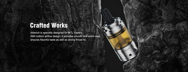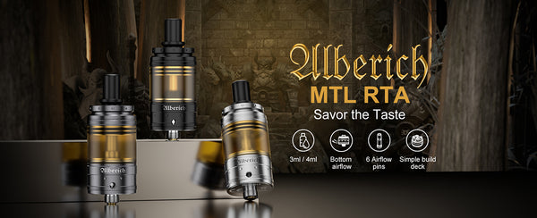 Alberich MTL RTA of 22mm diameter is specially designed for MTL vapers. With bottom airflow design, it can bring you flavorful taste and strong throat hit. It has 6 airflow pins to optimize vapor experience: 0.8mm/1.0mm/1.3mm/1.6mm/2.0mm/2.5mm. The 4 screws design and improved cotton slot can make the coil building easier. Alberich MTL RTA also features 3ml/4ml PEI & glass tube (3ml/4ml glass tube are sold separately & 3ml/4ml PEI tube are included) and easy top filling system.