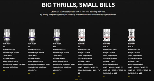UFORCE-L Tank of 25.5mm features 4ml/5.5ml capacity and easy top filling system. It is designed with 3-hole top air inlets to deliver the balanced & sufficient airflow and avoid condensate & e-juice leakage effectively. The 360 degree adjustable airflow can also customize your favorite flavor. By adopting the innovative 510 base with heatsink design, it is easy to clean. Constructed from durable stainless steel, the UForce-L Tank can deliver outstanding flavor and vapor from your favorite eJuice or nicotine salt. UFORCE-L Tank includes new PnP Coil 0.15ohm/0.2ohm with Dual In One Tech in the package to bring you richer taste, denser cloud and longer lifespan. In addition, the 4ml straight glass comes natively on the tank but can be upgraded to the 5.5ml bubble glass.