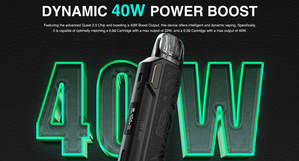 Featuring the advanced Quest 2.0 Chip and boasting a 40W Boost Output, this device offers intelligent and dynamic vaping. Specifically, it is capable of optimally matching a 0.6ohm Cartridge with a max outputof 22W, and a 0.3ohm Cartridge with a max output of 40W.