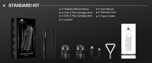 Lost Vape Thelema Elite 40 Kit houses a built-in 1400mAh battery with a 5-40W output range. Its groundbreaking E Plus Cartridge System accommodates 3ml e-liquid capacity, complemented by bottom airflow...