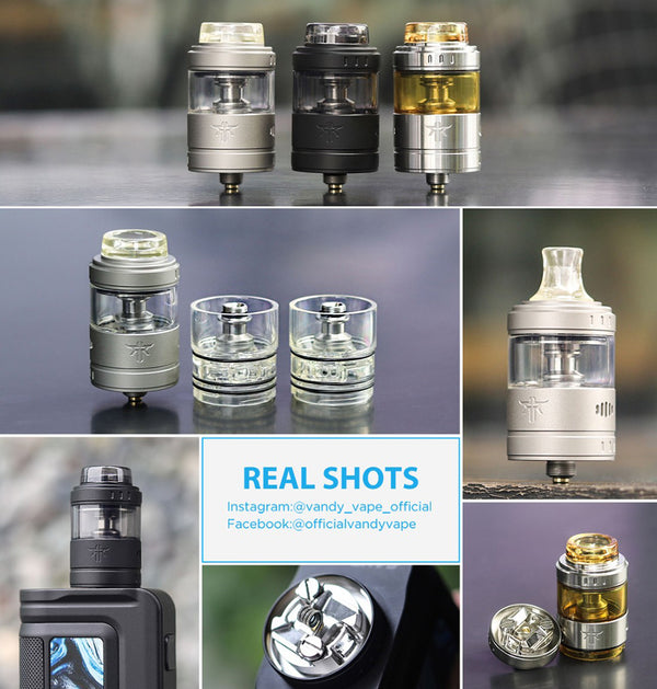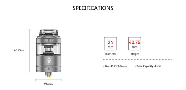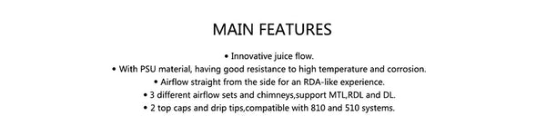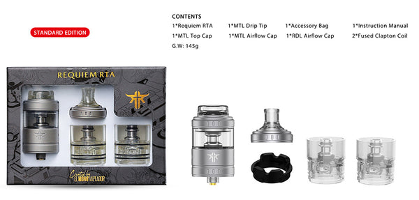 Vandy Vape Requiem RTA of 24mm is made of PSU material that has high temperature and corresion resistance. It is designed with 4.5ml e-juice capacity and innovative juice airflow. It has 3 airflow sets & chimneys and supports MTL, RDL and DL vaping. It also features airflow straight from the side for RDA-like experience. The versatile tank offers 810 and 510 systems with 2 top caps and drip tips, and the PSU airflow cap is high temperature and corrosion resistance, which is machined and constructed well.
