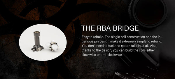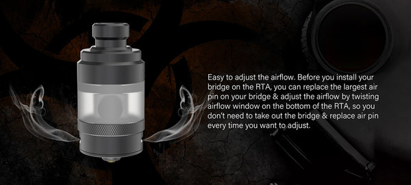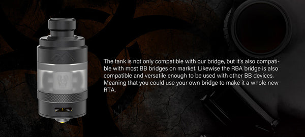 The design concept of the Hazard RTA is derived from Bio Hazard gas masks with the bridge design looking similar to side filters. Along with the cool appearance, you'll find this latest RTA playful and be amazed by its adaptability. As an RTA tank, the Hazard produces great flavors & can be utilized in two ways.