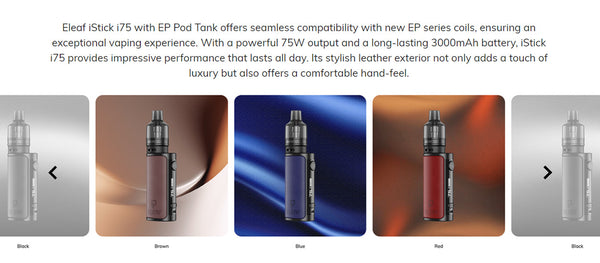 Eleaf iStick i75 Kit with stylish leather exterior is luxurious and comfortable to hold. It is composed of iStick i75 Device and EP Pod Tank 5ml. It is powered by a built-in 3000mAh battery with 75W max to bring you long-lasting vaping experience. Its OLED screen allows you to switch between VV (Variable Voltage) and VW (Variable Wattage) modes, granting you control over wattage levels from 1-75W and voltage from 0.5-9V. The EP Tank, with dual-side airflow control, offers a wide range of vaping experiences, from tight MTL to DL. This kit features a luxurious leather and metal construction, complete with a side-mounted round fire button for added convenience and comfort. With USB Type-C charging, it ensures a long-lasting vaping experience and supports EP Series Coils for rich clouds and enhanced flavo. Experience personalized vaping with the optional UI interface on this premium kit.