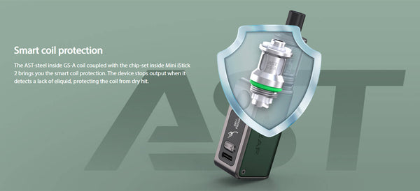 AST is short for ALL-TIME STABLE TECHNOLOGY. Super austenitic stainless steel (AST-steel) is adopted as the coil material of GS-A, which delivers ultra rich and pure flavor in an instant and supports longer lifespan than ever. Also the AST-steel inside GS-A coil coupled with the chip-set inside Mini istick 2 will bring you the smart coil protection. The device stops output when it detects a lack of e-liquid, protecting the coil from dry hit.