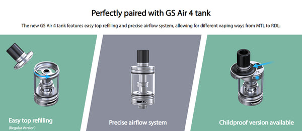 The new GS Air 4 tank features easy top refilling and precise airow system, allowing for different vaping ways from MTL to RDL. Most is worth mentioning is GS Air 4 Tank's high compatibility. Expect from newly developed GS-A 0.8ohm Coil (Wattage Range: 8-15W Austenite) and GS Air 1.4ohm Coil (Wattage Range: 6-12W Kanthal), it utilizes all GS Air coils - find the perfect flavor by playing with different coils.