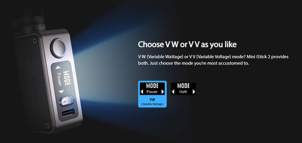 Mini iStick 2 successfully combines Manual&Auto in one mod. Everyone could freely choose your vaping style between button-activated and draw-activated mechanism. (*Draw-activated mechanism only works with GS Air 4 Tank). VW(Variable Wattage) or VV(Variable Voltage) ? Mini iStick 2 provides both. Just choose the mode you're most accustomed to.