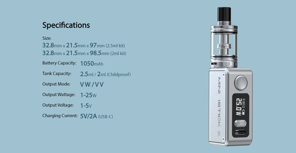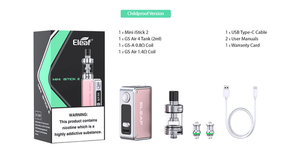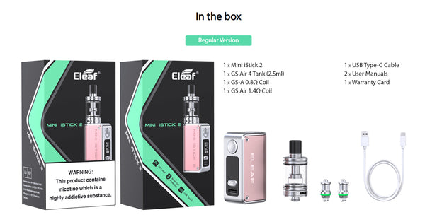 Eleaf Mini iStick 2 Kit is a new mini box mod kit combined Mini iStick 2 box mod and GS Air 4 Tank. It comes with everything about a nice box mod vape in the smallest size. Always with USB Type-C 2A quick charge, only about half an hour is required to fully charge the internal 1050mah battery of Mini istick 2.