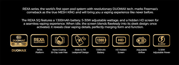 Freemax Rexa SQ Kit is compatible with a 2ml Rexa Series cartridge with an integrated mesh coil. The internal battery is listed at 1300mAh and rated for up to 30W...