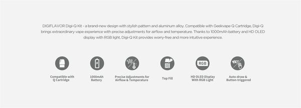 Digiflavor Digi-Q Kit - a brand-new design with stylish pattern and aluminum alloy. Compatible with Geekvape Q Cartridge, Digi-Q brings extraordinary vape experience with precise adjustments for airflow and temperature....