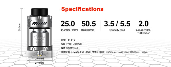 Hellvape Dead Rabbit 3 RTA features a diameter of 25mm. Finished with a postless deck for dual coil configuration, incorporating a 3.5ml vape juice capacity, you can also choose a...
