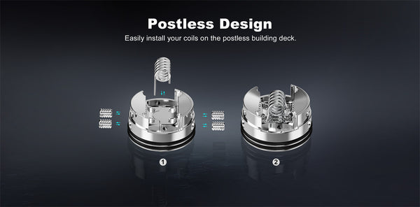 Hellvape Dead Rabbit Mini RDA features of is 20mm diameter. With the detachable beauty ring in the pack, it has a 22mm diameter, which makes it look good and works perfectly with the most powerful AIO kit. Hellvape Dead Rabbit Mini RDA is equipped with a postless build and allows you to build a single coil with ease.