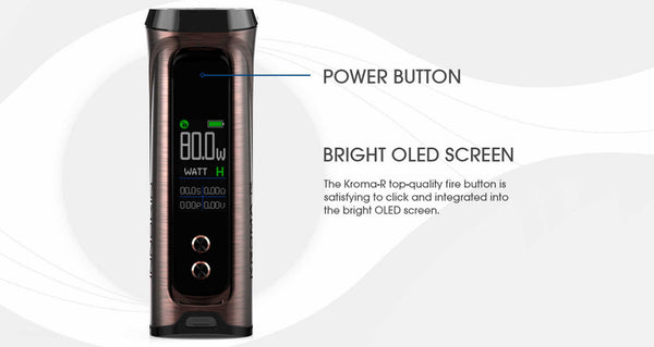 The Innokin Kroma R Zlide Mod Powered by single 18650 batteries(not included), Kroma R has 80W high power, which can definitely satisfy the vapor chaser. In addition, the Kroma R Mod uses Innokin's proprietary chip with the most diverse features and all the most popular working modes. Enjoy great vaping with Wattage (6-80W) and Voltage (1-7.5V) outputs and Soft, Normal and Boost Modes. All important information is clearly displayed on the bright OLED screen including battery charge, wattage/voltage, coil resistance, puff count, voltage out and wattage lock. The Kroma-R features 2A MicroUSB quick charge and integrated safety protections.