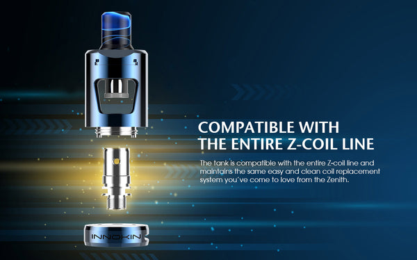 The Innokin Zlide tank is not designed to replace the Zenith, but rather to offer a more cost effective solution while addressing some requests from Zenith users. The tank is compatible with the entire Z-coil line and maintains the same easy and clean coil replacement system you've come to love from the Zenith. To save cost for you, this tank does not feature a liquid shut off as found on the Zenith which is why it will only come in a 2ml, 22mm format allowing you to take advantage of the easy slide filling top cap without the risk of flooding the coil.The top cap also features a child-proof design. Removing the mouthpiece first allows the top cap to slide open. With the mouth piece in place, the cap is locked closed.The tank can also be unscrewed in order to clean the inside or replace the glass tank section.The top slider can also be disassembled to replace the silicone seal.
