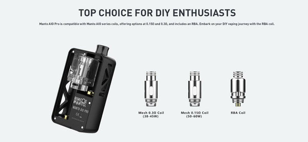 Rincoe Manto AIO Pro Kit is the new product of the Rincoe Manto series, featuring an external 18650 battery (not included), 3.5ml e-liquid capacity and 80W maximum output power. As part of the new line of the Rincoe Manto series, the AIO Pro offers increased power and compatibility with all Manto AIO coils, ensuring smooth and impressive vapor production. Users can customize their kit with Rincoe panels for added personalization. Key features include a 10-80W output range, Smart/RBA modes, the Manto 2.0 chip, and an airflow system for a versatile vaping experience catering to MTL, DTL, and DIY preferences.