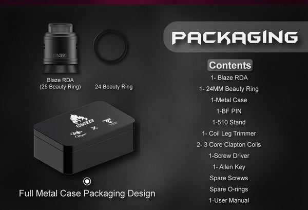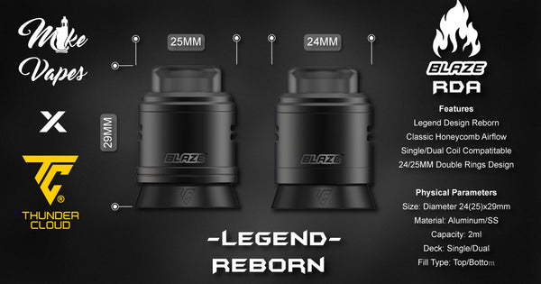 Thunder Cloud Blaze Dual RDA is designed by Mike Vapes and is engraved with the name of the model, supplied with a single coil & dual coils postless build deck...
