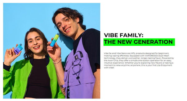 VIBE SE & Vibe Nano Pod Designed for MTL beginners, this duo combines simplicity with advanced performance. Powered by the Axon Chip, both devices feature one-button operation and VAPORESSO's ​Dual...