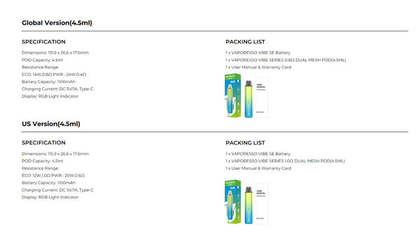 VIBE SE & Vibe Nano Pod Designed for MTL beginners, this duo combines simplicity with advanced performance. Powered by the Axon Chip, both devices feature one-button operation and VAPORESSO's ​Dual Mesh technology (0.8ohm ECO mode at 14W for flavor exploration; 0.6ohm PWR mode at 24W for instant satisfaction), delivering ultra-smooth, enduring taste even for veteran vapers. The ​1100mAh battery supports all-day use, recharged swiftly via Type-C (5V/1A). A ​4.5ml leak-resistant pod minimizes refills, while the RGB light indicator simplifies power monitoring.it's your pocket-sized gateway to hassle-free vaping.