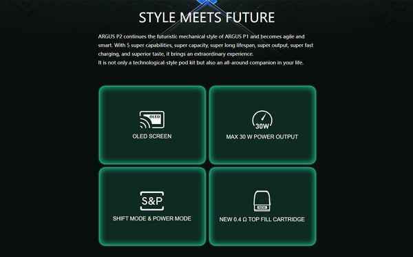ARGUS P2 continues the futuristic mechanical style of ARGUS P1 and becomes agile and smart. With 5 super capabilities, super capacity, super long lifespan, super output, super fast charging, and superior taste, it brings an extraordinary experience. It is not only a technological-style pod kit but also an all-around companion in your life.