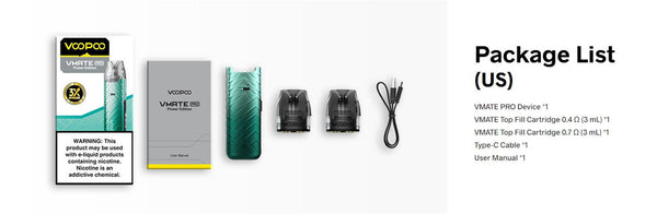 Cartridge Included: VMATE Top Fill Cartridge 0.4ohm; VMATE Top Fill Cartridge 0.7ohm